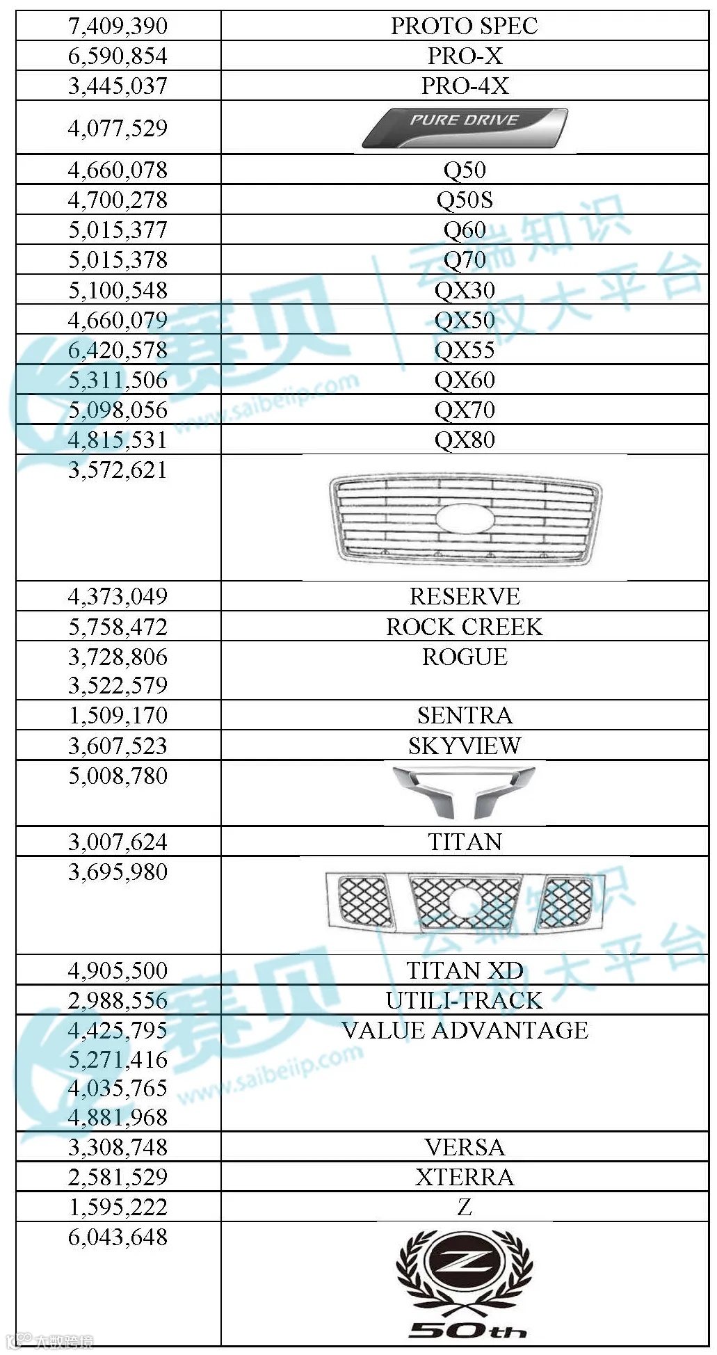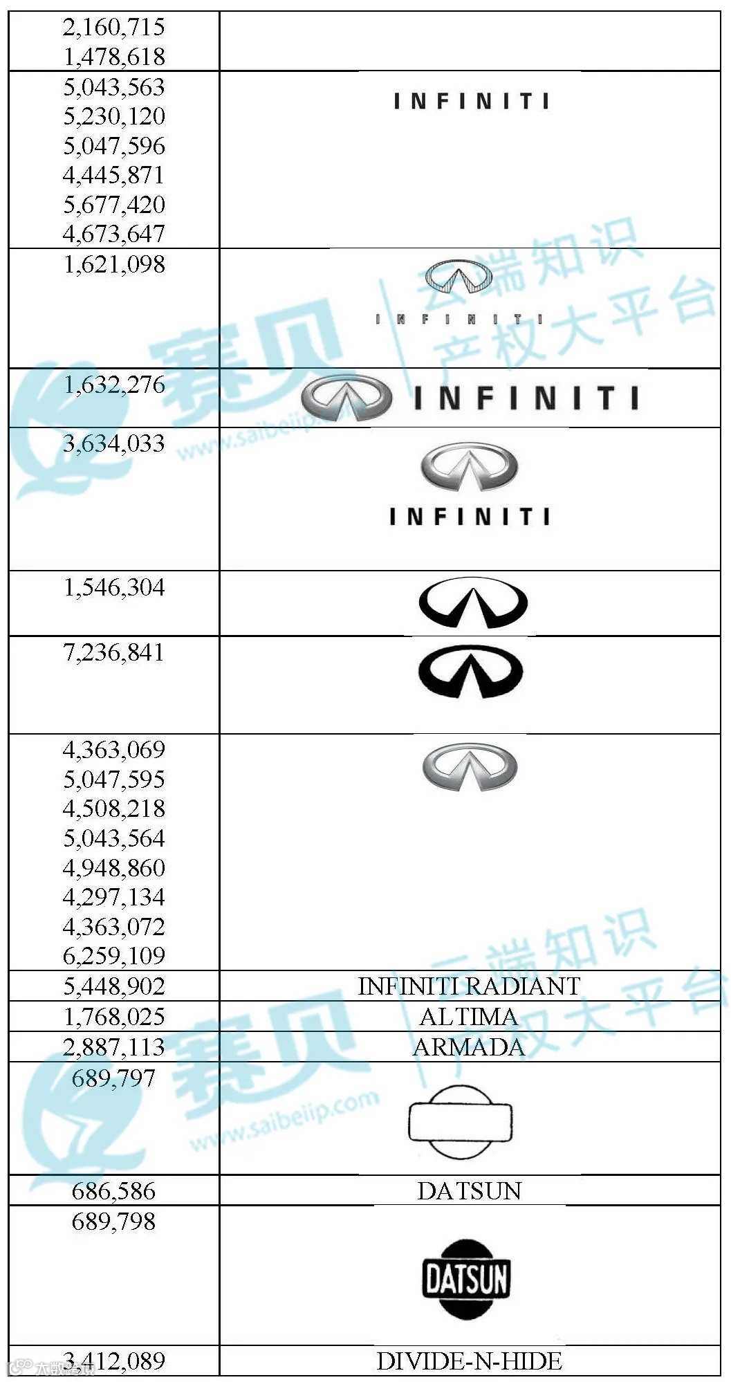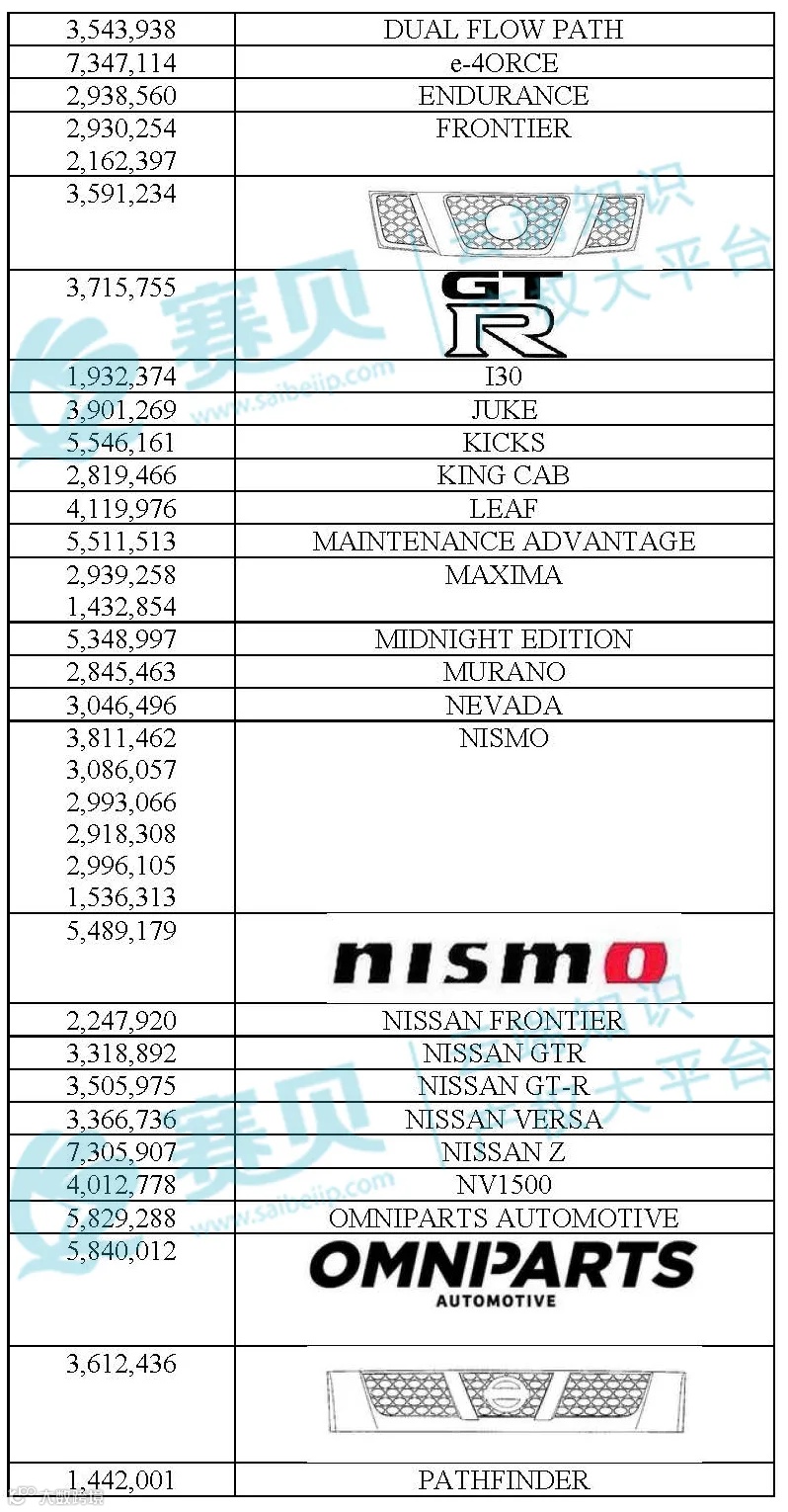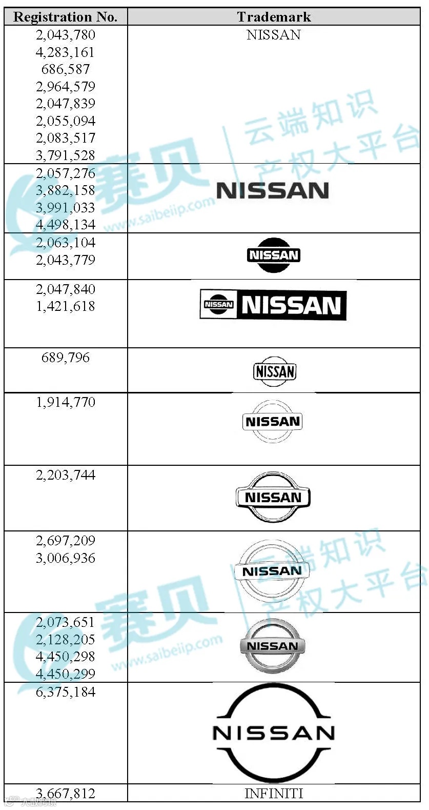 1. 主品牌商标:NISSAN、INFINITI(英菲尼迪)、DATSUN(达特桑)等;