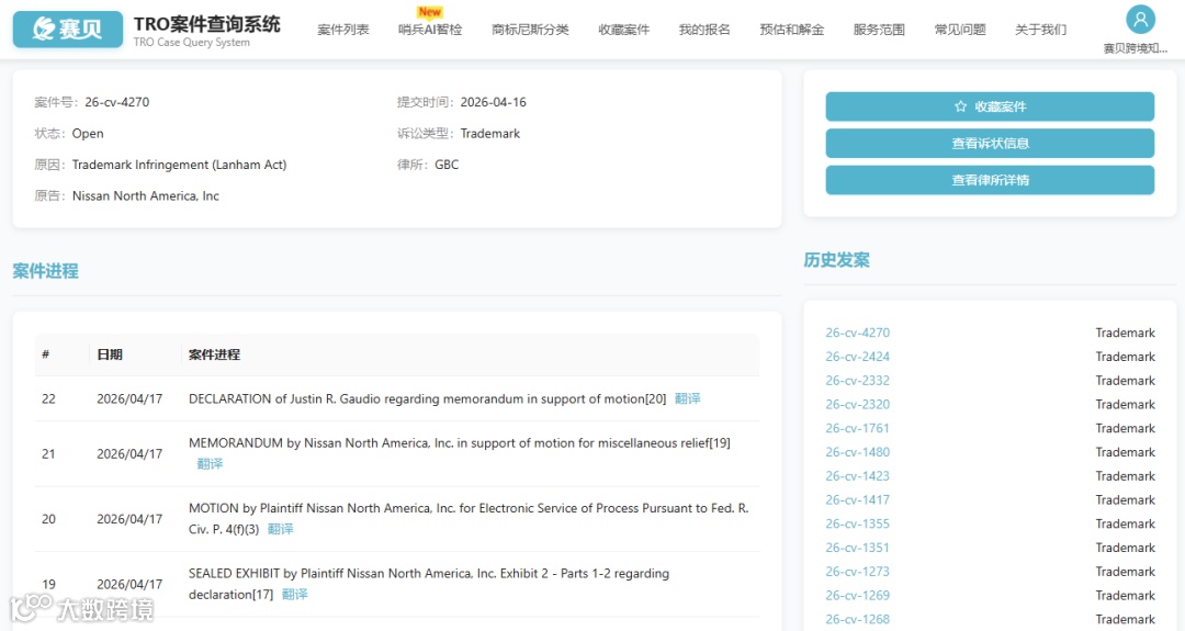 据赛贝TRO案件查询系统信息,日产北美公司(Nissan North America, Inc.)委托GBC律所于2026年4月16日发起跨境商标侵权诉讼,指控多家电商卖家在线销售侵权产品。核心维权商标包括NISSAN及旗下INFINITI、NISMO、ROGUE等系列注册商标,商标风格简洁辨识度高,涉及汽车配件、服饰及家居全品类产品。