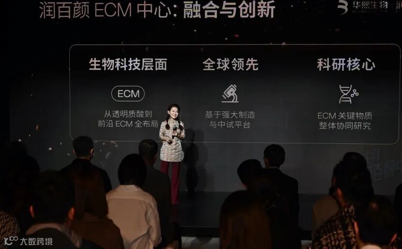 在发布会现场,华熙集团董事长、华熙生物董事长兼总裁赵燕在致辞中深入阐释了品牌战略布局。她指出,ECM(细胞外基质)是孕育复杂生命的“温床”。它不仅是细胞的物理支架,更是细胞间分工、感知与思考的“信号场”,决定了细胞的命运与功能,是生命从简单走向高级的基石。