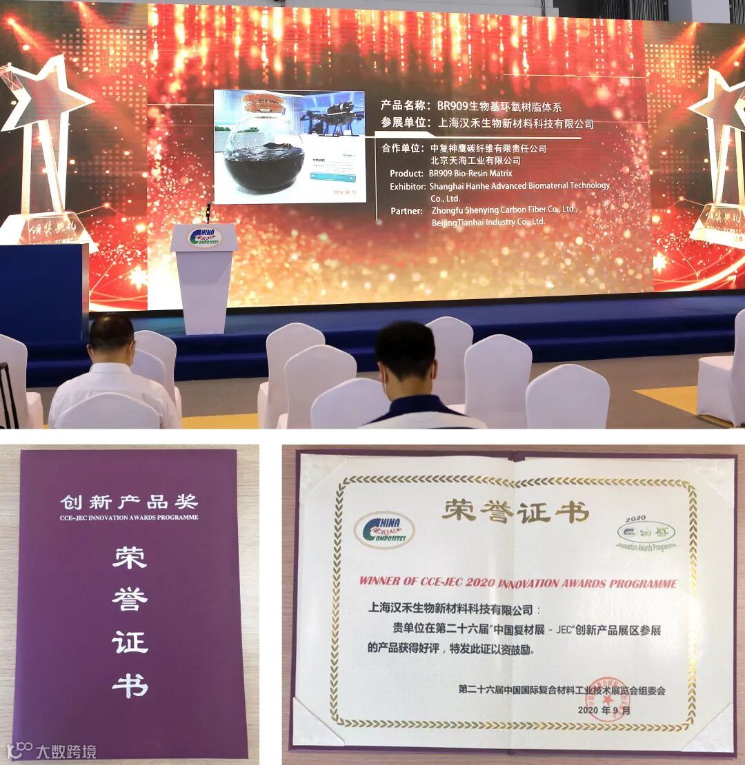 汉禾在本届CCE-JEC创新产品评选活动中报送的生物树脂BR909以农作物秸秆等生物质材料为原料,运用独创技术工艺和独家配方制备而成,与碳纤维结合体现出优异的力学性能,是一种全新的基体材料。在与合作单位天海工业、中复神鹰的长期联合试制中,BR909在性能、经济性、环保性等方面的优势得到了充分验证。