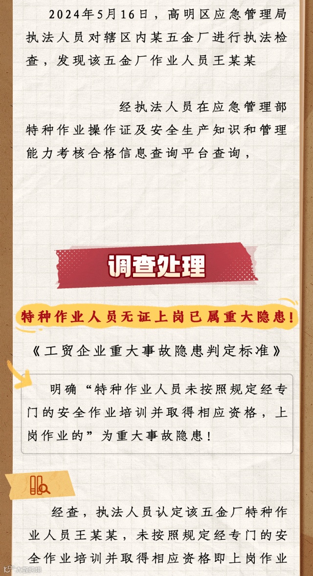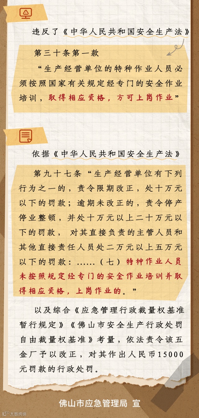 安全生产需居安思危,时时处处警钟长鸣,为进一步防范遏制事故发生,佛山市应急管理局组织开展“以案普法”安全生产执法典型案例系列宣传,分为特种作业人员无资质上岗、未如实记录事故隐患排查治理情况、违规储存危险化学品、未统一对承包租赁方进行协调管理、未如实记录安全生产教育和培训情况等5个类别,采取“以案释法”的形式,为企业、群众释法析理,引导全社会尊法学法守法用法,助力企业合规经营,提升全市生产安全风险防控能力和水平。