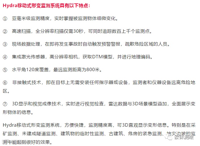Hydra移动式形变监测系统,方便快捷,监测精度高,可3D直观显示变形信息。特别是在采矿监测、未建成隧道监测、建筑物的临时性监测、古建筑、危房的紧急监测、地灾边坡的监测中能起到很好的效果。