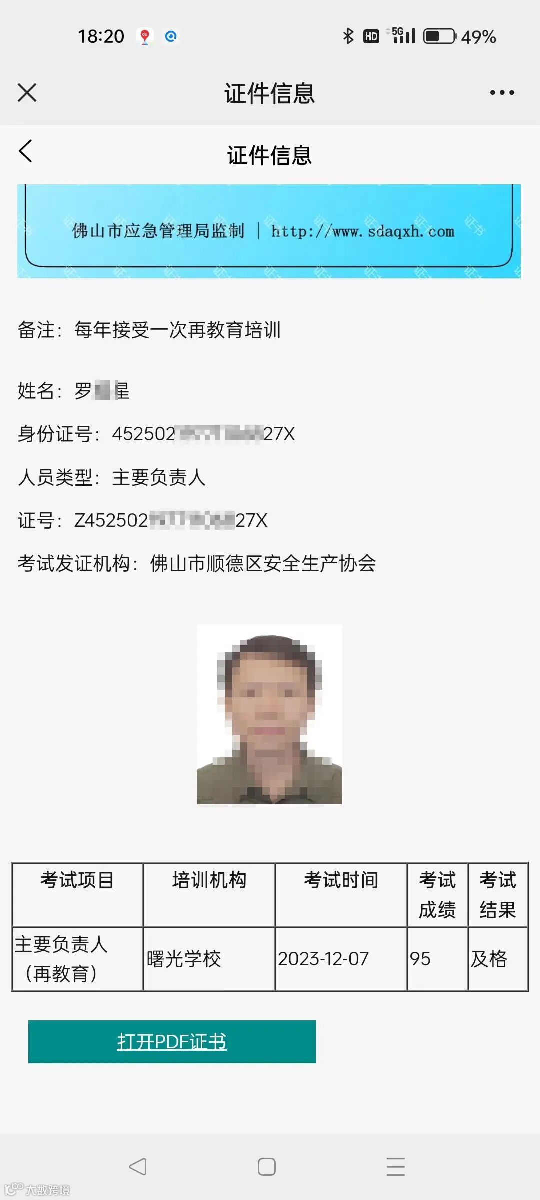 9、安管员证(或)主要负责人证的网上考试记录截图2份(用微信扫一扫安管员或负责人电子证书上面的二维码,或进入“曙光学校”公众号,然后点右下角“业务办理”--“安管员负责人查询”--“证书查询”,截图姓名+2023年考试成绩的页面,然后打印2份)。