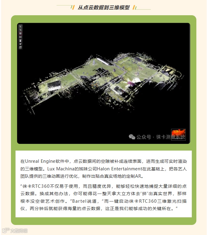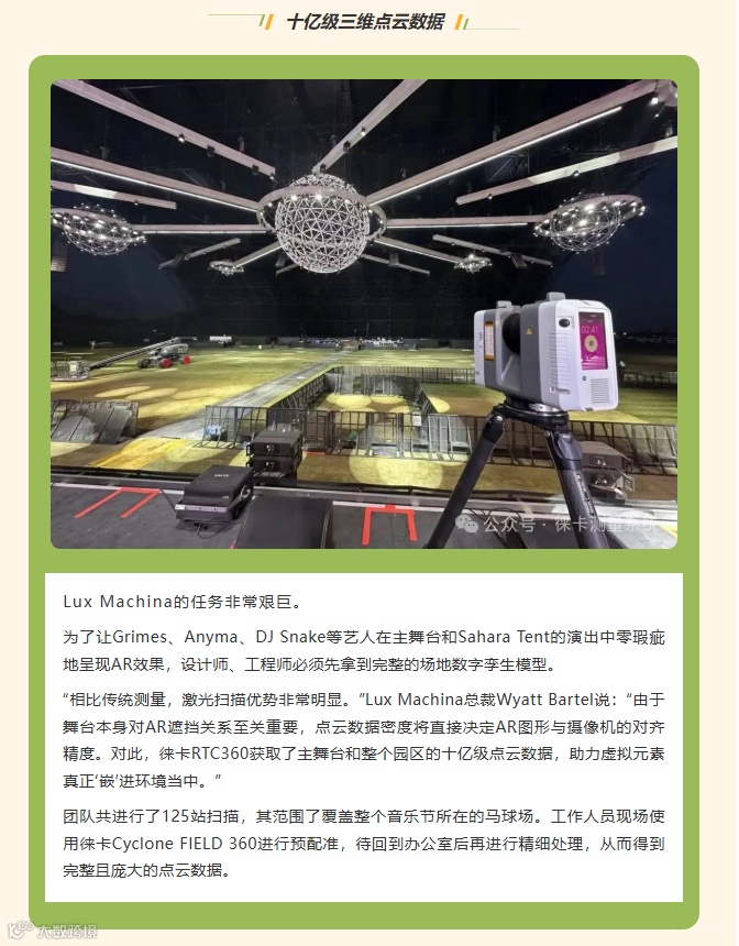 增强现实(AR)体验——那些借助屏幕与手机,在巨型舞台与人群上空穿梭的3D数字影像——正是演出不可或缺的一部分。要让25万双眼睛同步看到同一场虚拟奇观,其复杂程度可想而知。因此,为影视、电视及现场活动提供前沿视效技术的Lux Machina,选择使用徕卡RTC360三维激光扫描仪作为其得力助手。