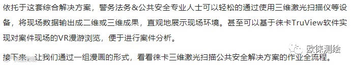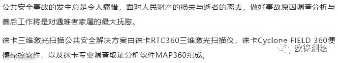 现场采集:事故现场采用徕卡三维激光扫描设备进行数据采集数据拼接:专利的VIS视觉追踪技术支持实时数据查看、现场数据拼接检查数据分析&调查报告:采用徕卡MAP360软件进行调查取证分析黑科技辅助:徕卡TruView软件,支持使用VR漫游方式对相关成果进行全方位查看
