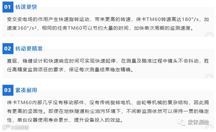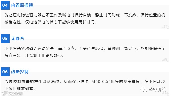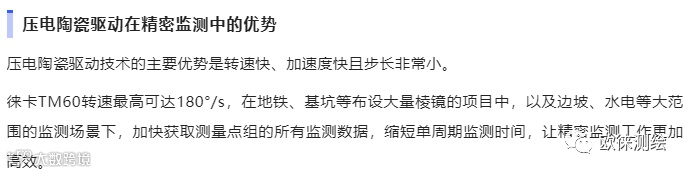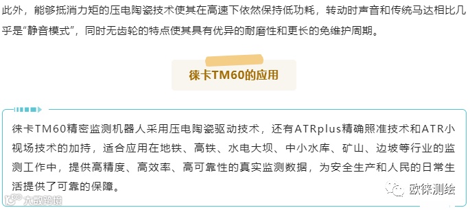 徕卡TM60精密监测机器人采用压电陶瓷驱动技术,通过压电效应能够将电能直接转化为机械能,在仪器旋转轴旁边,一对压电陶瓷对称分布在其左右,精确而快速地驱动固定在旋转轴边上的陶瓷柱形环。