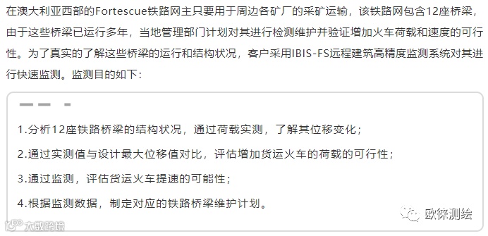 IBIS-FS远程建筑高精度监测系统以其极高精度、超高频率、可快速安装部署、非接触监测(无等特点帮助铁路管理部在几天的时间内完成了快速完成了12座铁路桥的监测。帮助客户收集了真实可靠的监测数据,为客户后续的维护分析提供了保障!IBIS-FS远程建筑高精度监测系统在桥梁、塔楼等建筑结构物的荷载、共振频率等实时监测中具有广泛的应用。