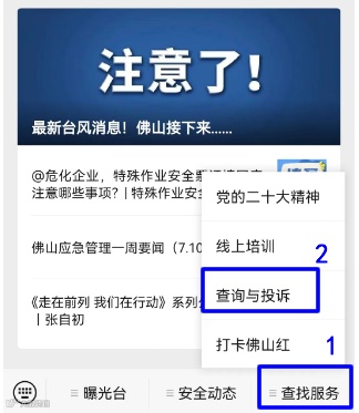 1、关注“佛山应急管理”微信公众号,点击【查找服务】菜单栏,点【查询与投诉】。