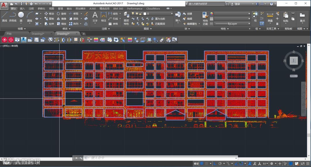 1)通过CloudWorx点云拓展软件,将点云导入到AutoCAD中,方便我们进行立面图的绘制。
