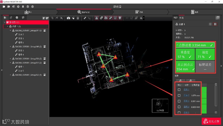 如果点云的拼接精度没有达到我们的要求,可以使用优化点群功能,软件会自动对拼接点云数据做进一步优化处理,提高拼接精度,从而保证数据成果的精度。