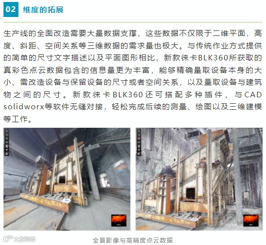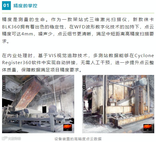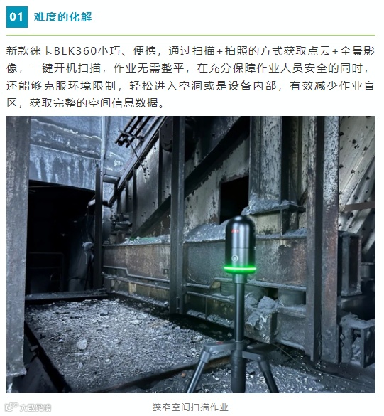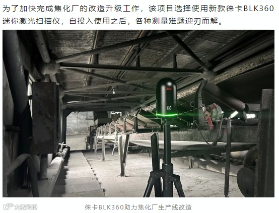 新款徕卡BLK360是一款性能升级的迷你三维激光扫描仪,集成了激光扫描、HDR全景图像和VIS视觉追踪技术,20秒即可获取高精度点云和全景数据,可实现点云拼接,为焦化厂以及其他工厂车间的翻新改造、数字化,提供了一个简单易用、轻松高效的三维实景采集解决方案。