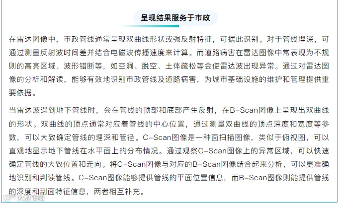 随着城市化进程的加速,市政基础设施建设的复杂性和重要性日益凸显。道路隐患、地下空洞、道路结构层病害、地下管网、隧道衬砌、水文地质等探测对于城市基础设施的安全运行、市政工作效率以及城市发展的可持续性具有重要意义。