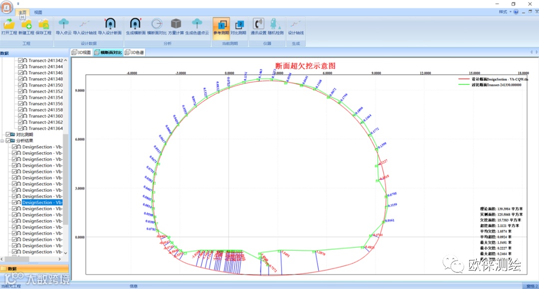 功能全面的后处理:后处理软件按设定步长沿隧道轴线批量生成任意里程隧道横断面,可以实现超欠挖断面分析、方量计算、衬砌分析、侵限分析等多种需求成果: