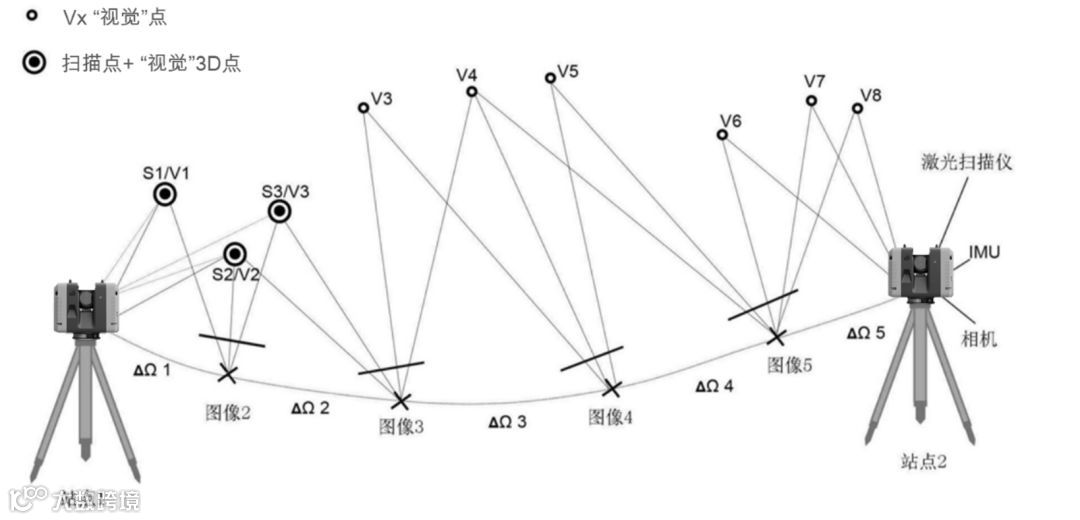 2. 移动仪器往站点2,连续采集图像进行空间特征分析,锁定空间特征点,进行定位和SLAM处理,直至站点2,完成SLAM处理,形成第一次搬站的最终SLAM结果。