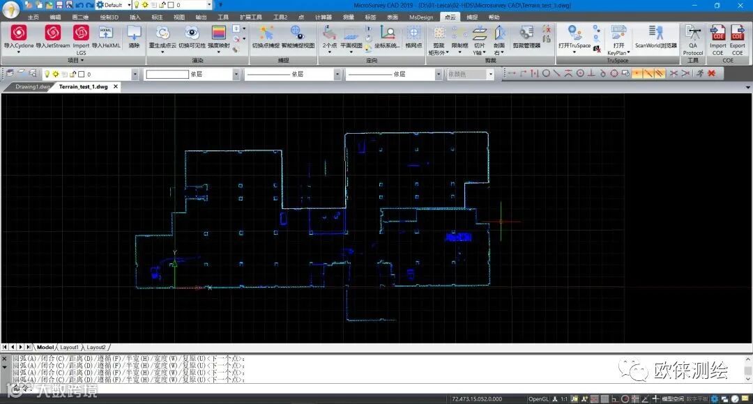 点云处理好后,需要根据绘图要求,将三维点云绘制成二维的平面图。使用徕卡CAD软件进行点云的加工成图,该软件是专门针对于测绘用户的CAD软件,自带徕卡CloudWorx插件能够将海量点云导入并绘图。此外还支持国内的标准图符库,直接绘制成标准的地形图成果。