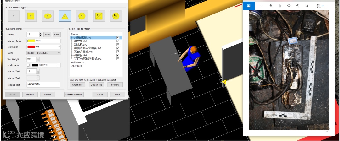 可以在三维点云上精确量取任意位置的尺寸信息,并进行子弹弹道、血迹喷溅等专业分析,并可以把所有物证信息准确标定在各自的实际位置上,基于场景计算出相关的因素。
