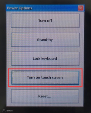 2、长按手簿开关机键2秒钟,在电源选项对话框中选择第四个选项“Turn on touch screen”来打开触摸屏。