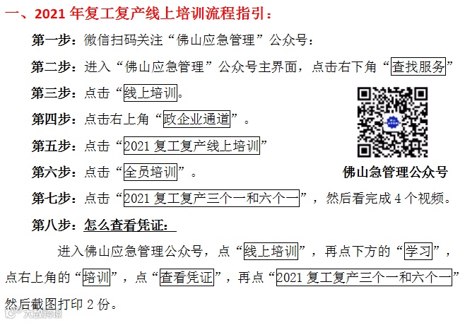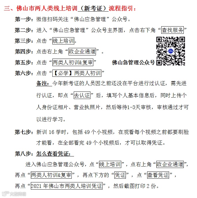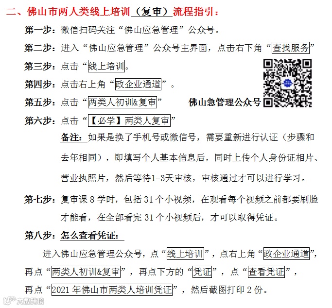 提醒1:2021年主要负责人、安全管理人员的新考、复审继续分为线上和线下两部分进行。线上培训的部分,有2个培训要学习并取得凭证,一个是“2021年复工复产线上培训”4学时,另一个是“佛山市两类人员线上培训”复审8学时新考16学时,完成二个线上培训后可以获取得2个线上学时凭证,在现场培训结束后在考试之前要递交2个学时凭证,不能递交学时凭证的不可以参加考试。