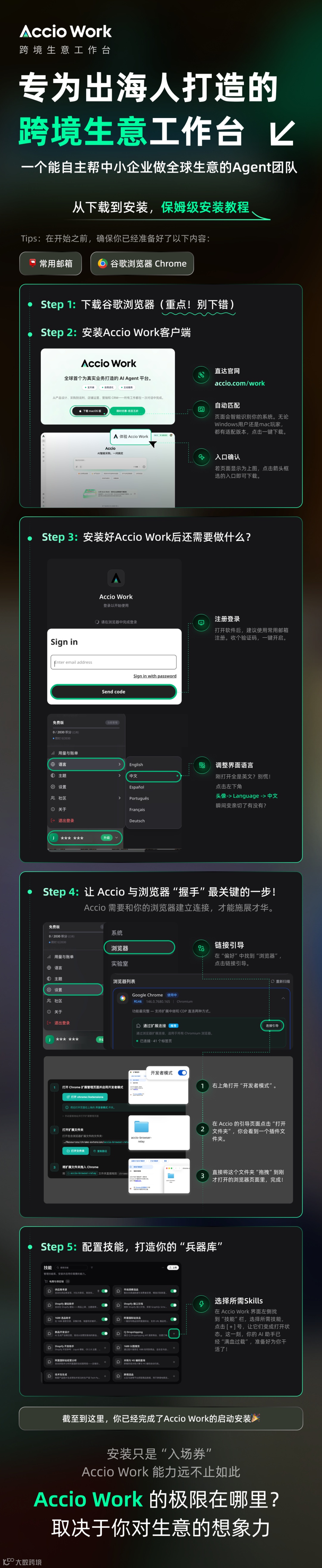 Accio Work = 更简单、更专业、更安全的“跨境电商版龙虾”。