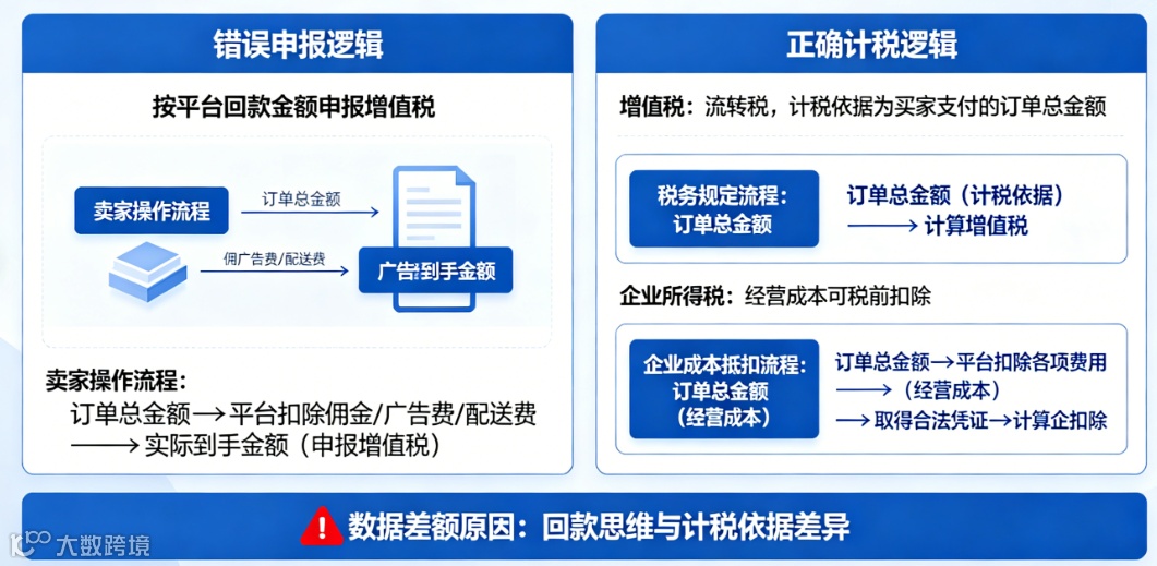 部分卖家长期以平台扣除佣金、广告费等后的实际回款作为增值税申报依据,但增值税计税基础应为买家支付的订单总额。平台扣除费用属于经营成本,需凭合法凭证在企业所得税前扣除,而非直接减少增值税税基。