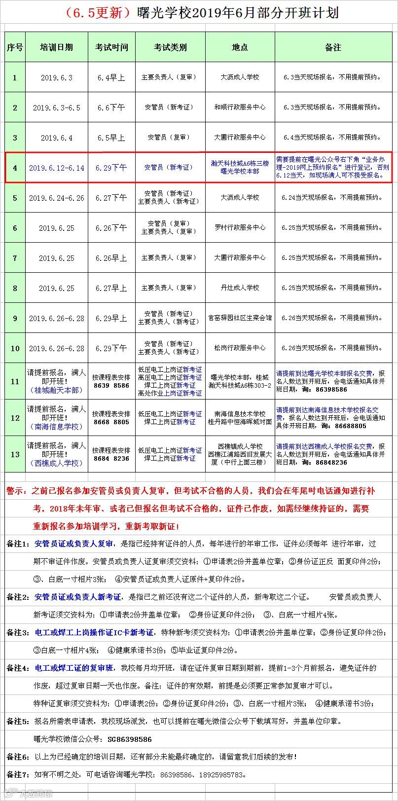 6.12-6.14在瀚天科技城A6栋三楼曙光学校本部进行的安管员新考证培训班,需要提前在曙光公众号右下角“业务办理-2019网上预约报名”进行登记,否则在6.12当天,如果现场报名人员超出场地可容纳情况,当天可以拒绝受非预约人员的报名,敬请配合,多谢!