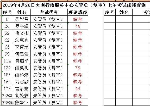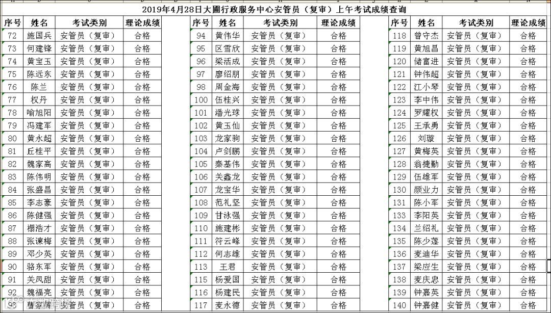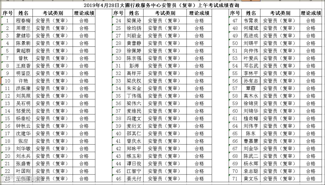 2019.04.28大圃行政服务中心安管员(复审)考试成绩查询