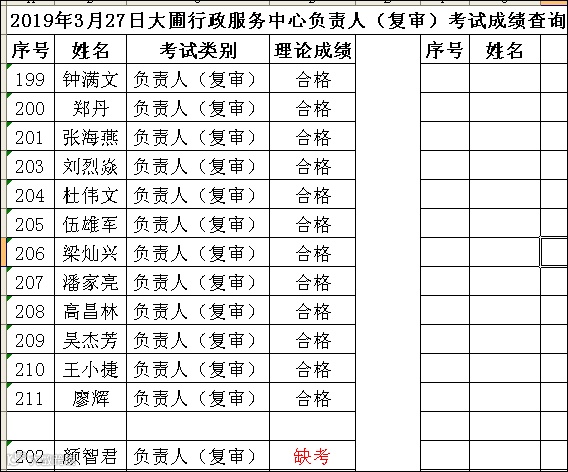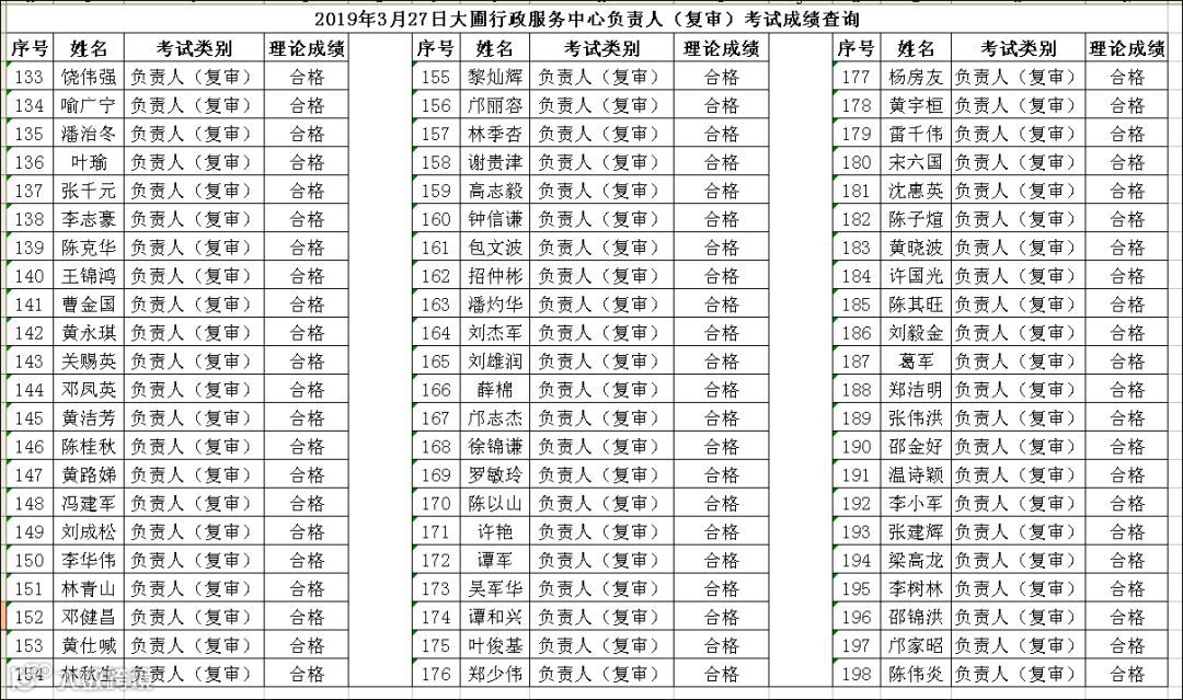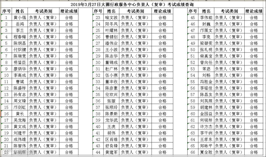 2019.03.27大圃行政服务中心主要负责人(复审)考试成绩查询