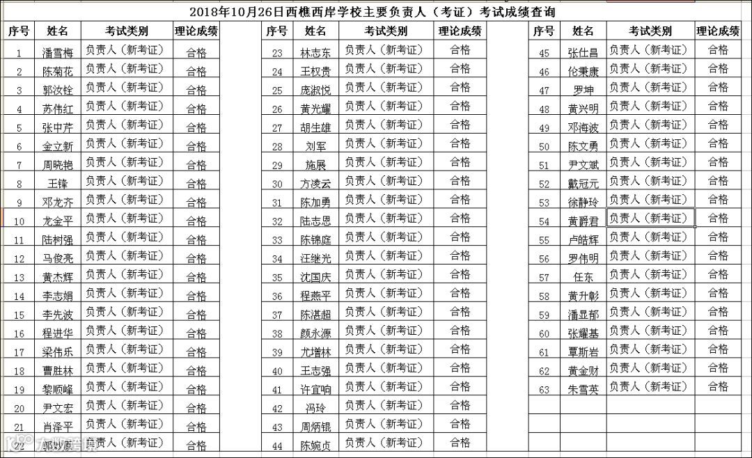 2018.10.26西樵西岸学校主要负责人(考证)考试成绩查询