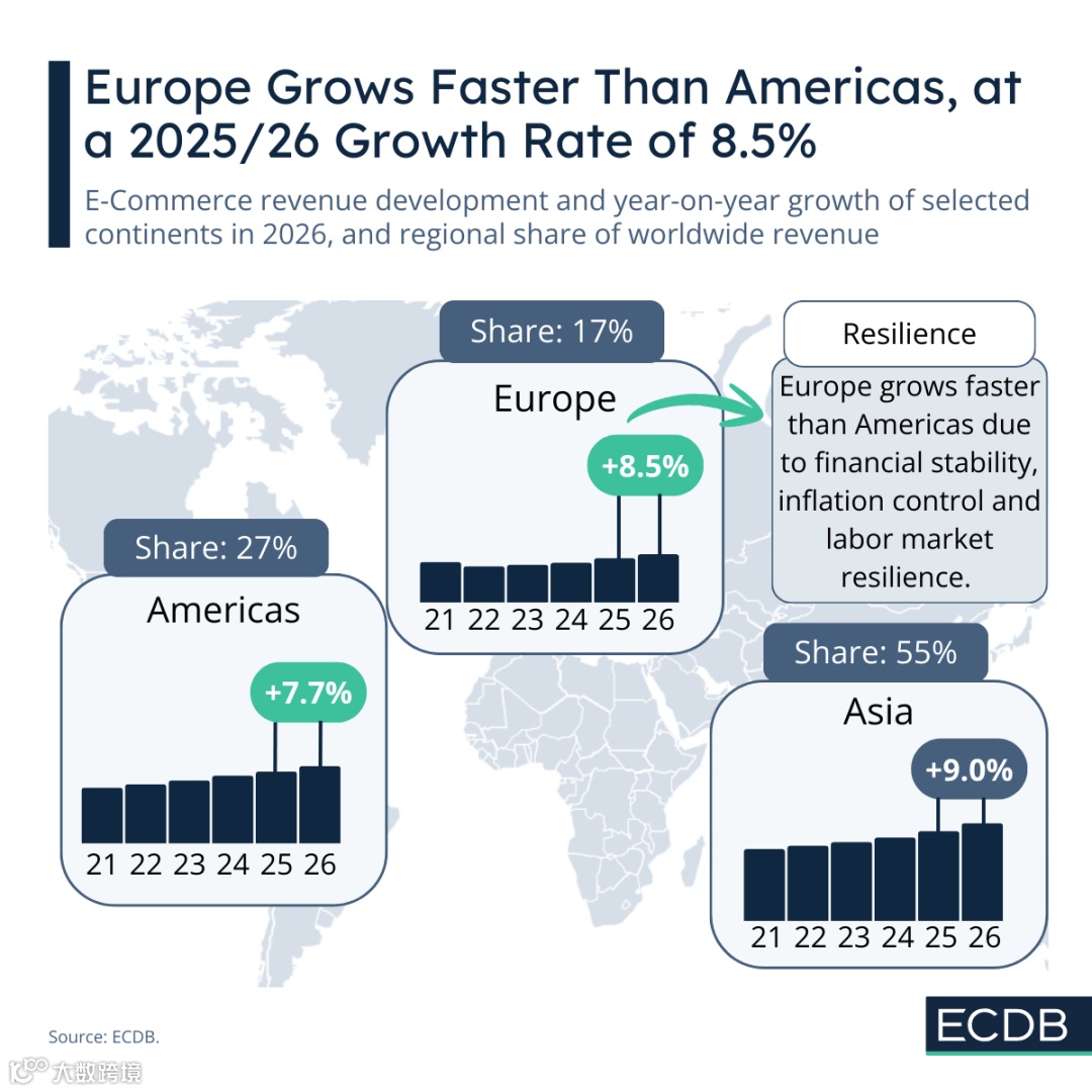8.5%增速反超北美,加上区域蓝海、供应链优势,跨境出海不用再死盯北美内卷,欧洲已是新的稳定增量市场。