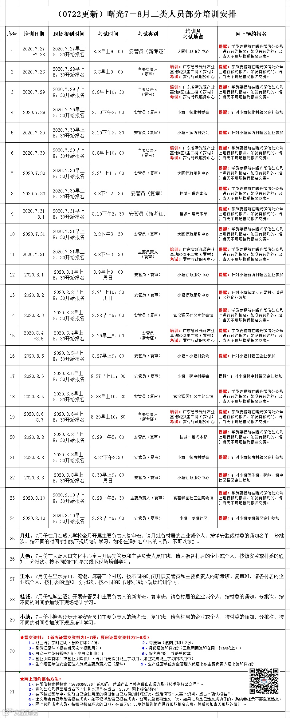 今年各镇街的培训安排,大部分都是先安排复审培训开班,然后再安排新考证培训开班, 我校7月下旬二类人员部分开班信息如下,请有需要的企业按辖区通知要求,分片区按不同的时间进行小班制培训,我校会严格按照市局的培训要求,“测体温、亮行程、戴口罩、分开坐、控人数”的原则进行: