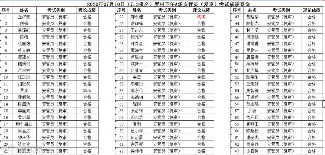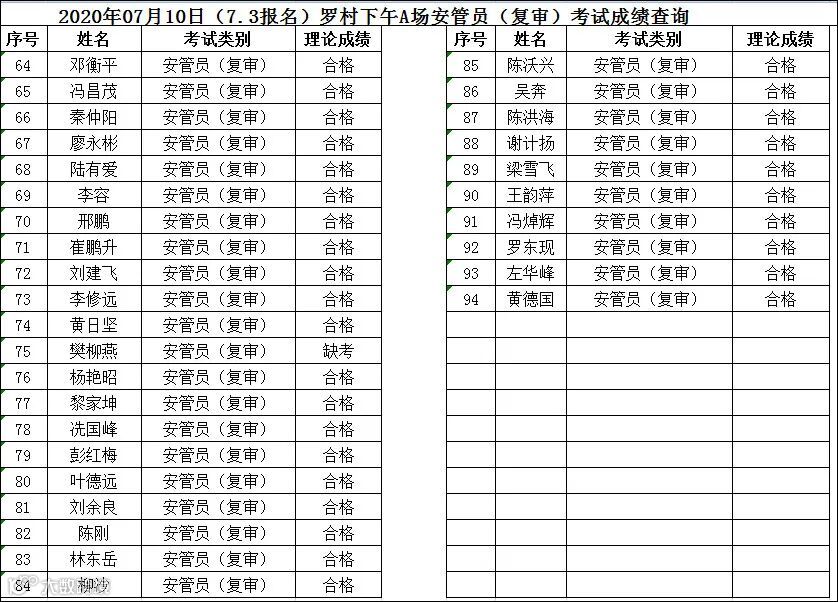 2020.07.10(7.3报名)罗村下午A场安管员(复审)考试成绩