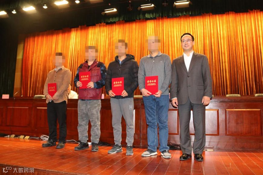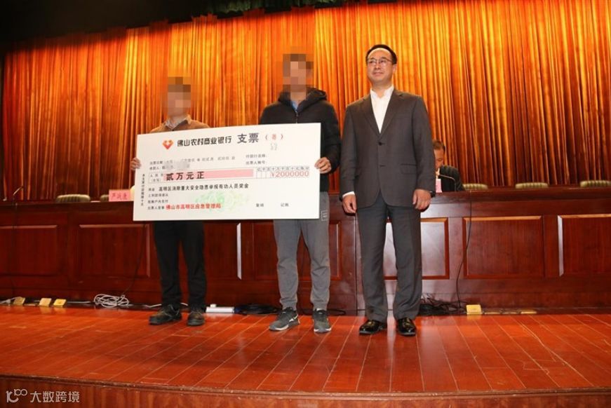 高明区委常委、常务副区长管雪对第一时间发现和报告重大安全隐患的两位同志颁发2万元的奖励金支票及荣誉证书,并为及时上报信息的两位村干部颁发了荣誉证书。
