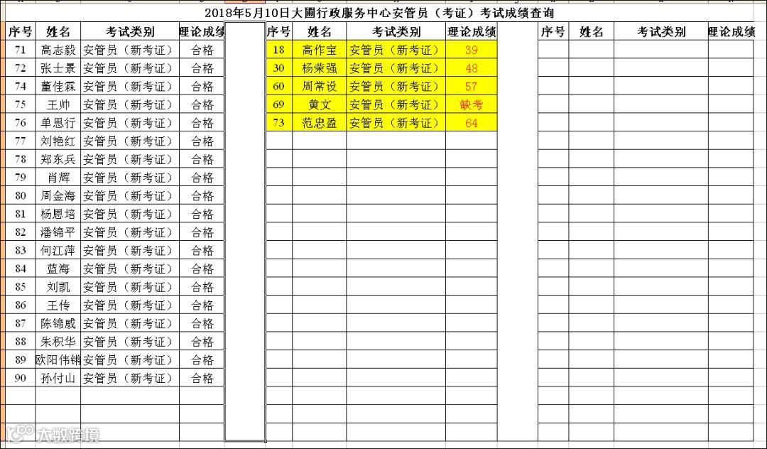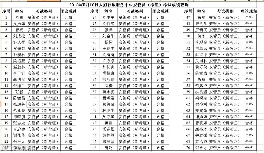 导读:2018.05.10大圃行政服务中心安管员(考证)考试成绩查询