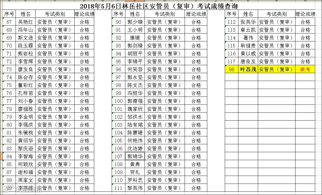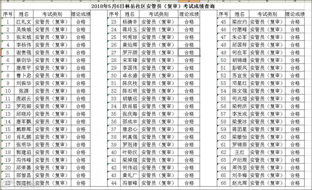 导读:2018.05.06林岳社区安管员(复审)考试成绩查询