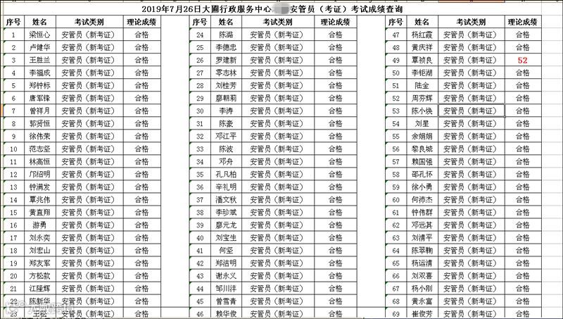 2019.07.26大圃行政服务中心安管员(考证)考试成绩查询