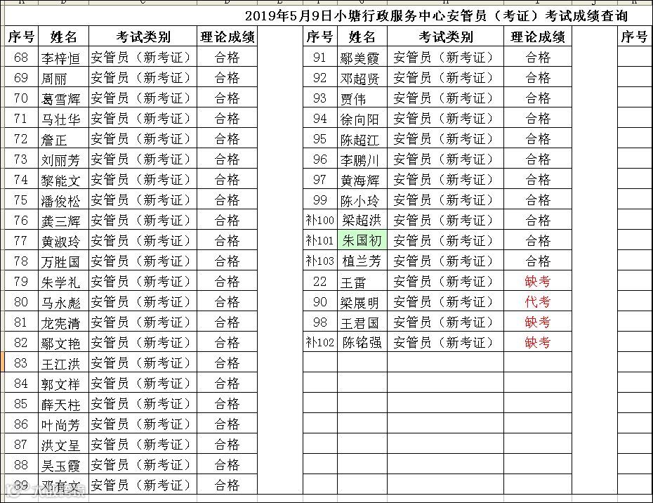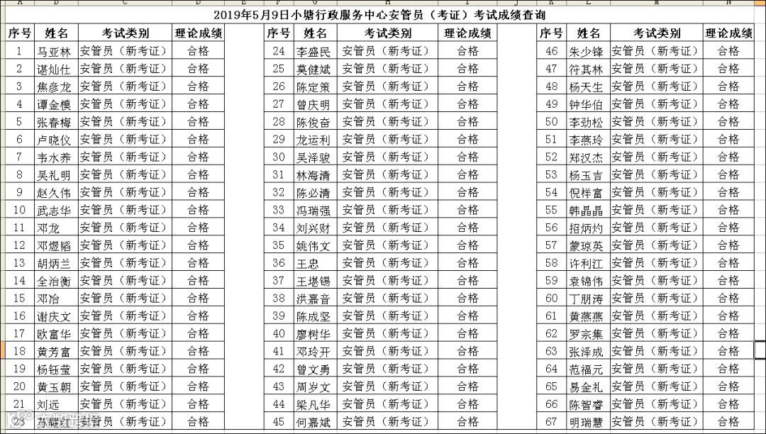 2019.05.09小塘行政服务中心安管员(考证)考试成绩查询