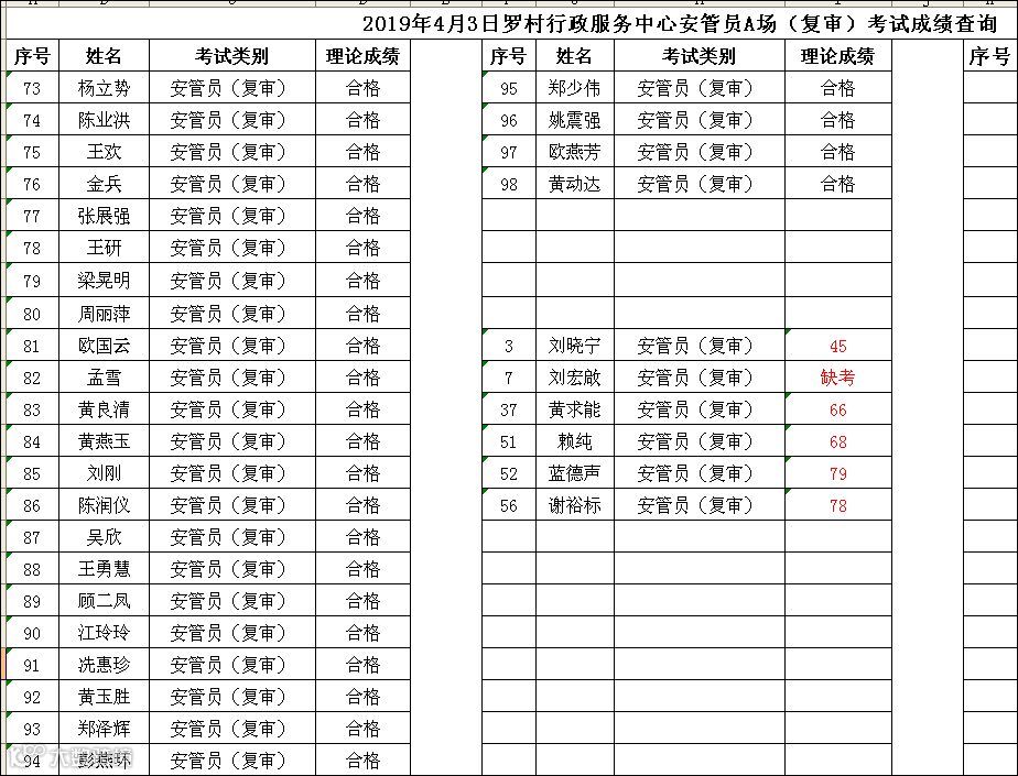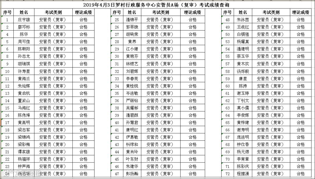 2019.04.03罗村行政服务中心安管员(复审)(9:30考试)成绩查询