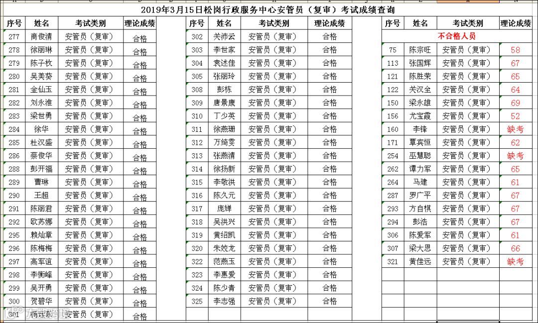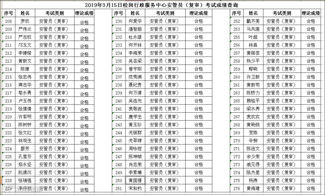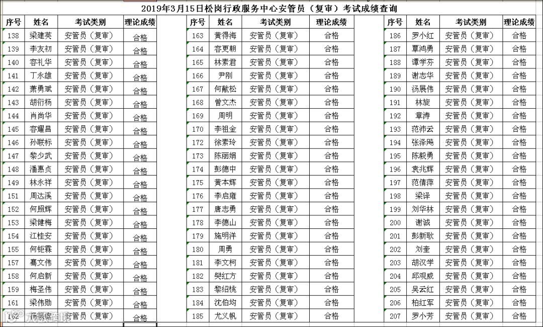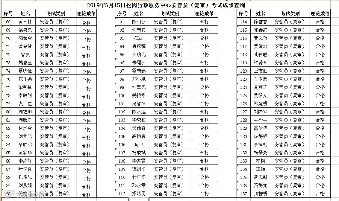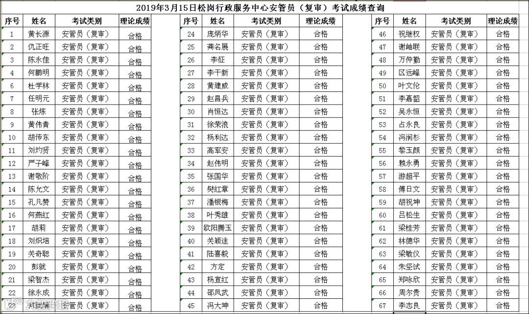 2019.03.15松岗行政服务中心安管员(复审)考试成绩公布