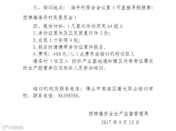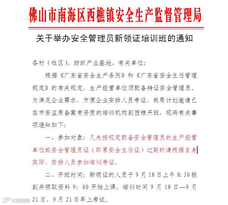 曙光学校于9月18日---9月21日在西樵镇海舟村委会,开办新一期安管员新考证班,请有需要的单位或个人,于18日当天早上8:30到海舟村委会现场报名交费,其他开班信息,请继续关注我校的公众号发布,咨询86398586、86320320。