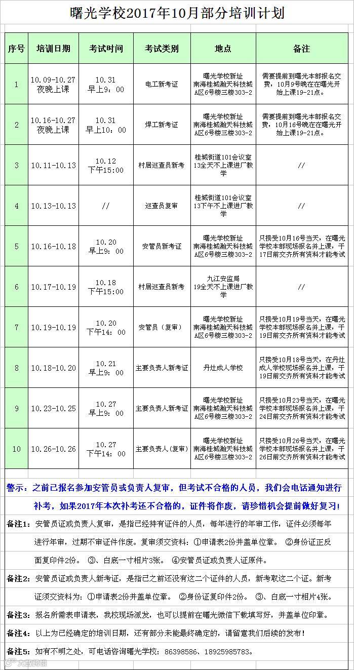 曙光学校10月份部份开班信息如下,请有需要的企业或个人联系我校或所属镇街安监或村委详询,曙光咨询电话:86398586、86320320: