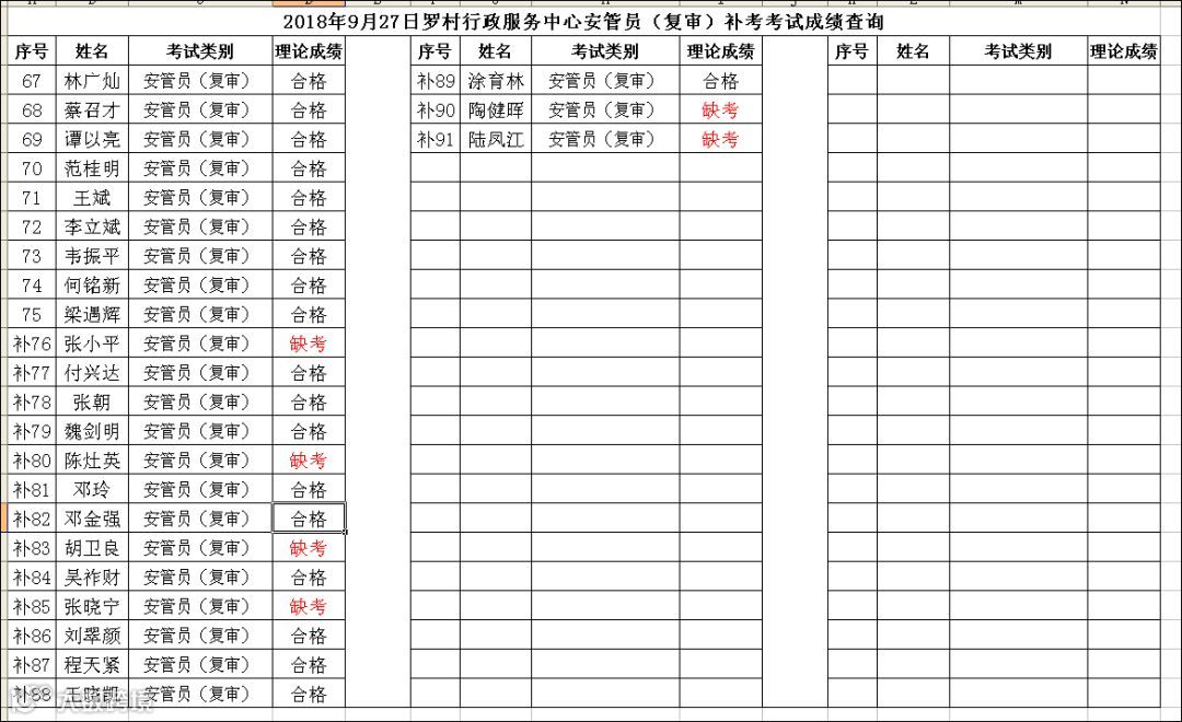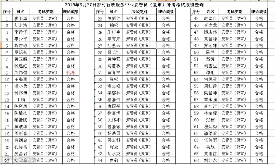 2018.09.27罗村行政服务中心安管员(复审) 考试成绩查询