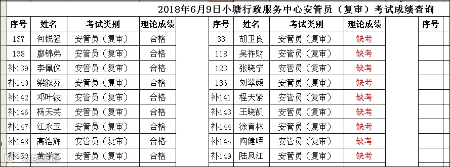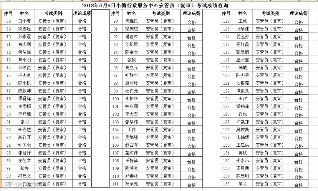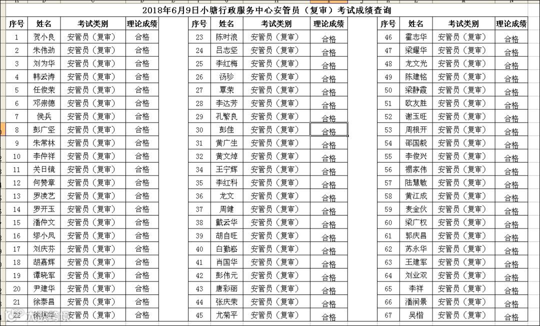 导读:2018.06.09小塘行政服务中心安管员(复审)考试成绩查询
