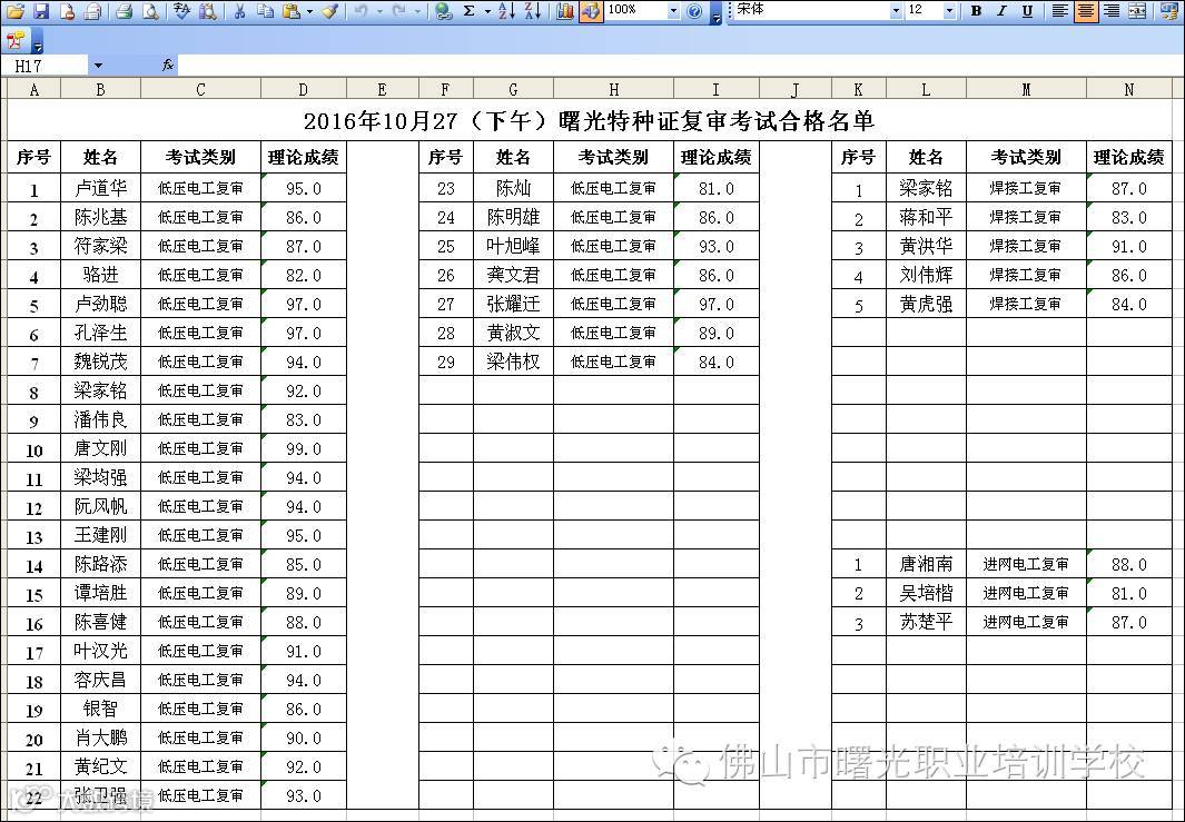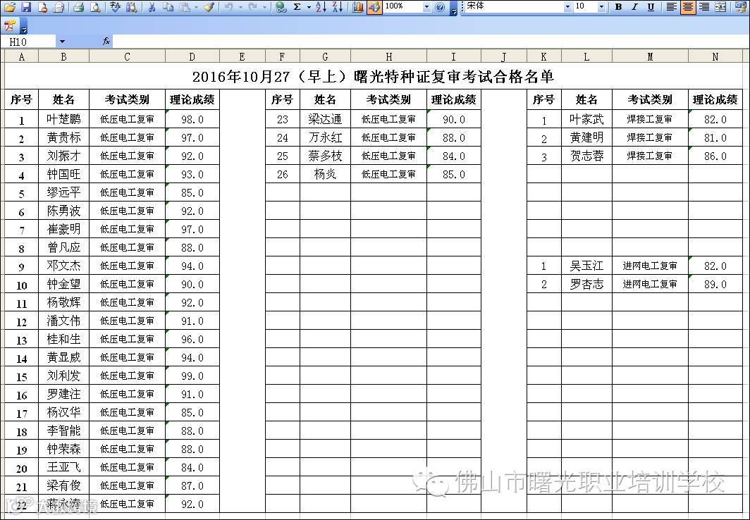曙光10.27(早上 + 下午)特种复审考试合格名单 佛山市曙安安全技术服务公司