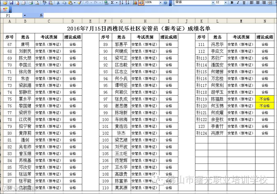2016.7.15西樵镇民乐社区安管员(新考证)考试成绩名单 佛山市曙安安全技术服务公司