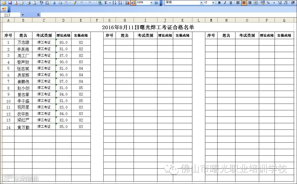 2016.8.11曙光学校焊工考证合格名单(补考班) 佛山市曙安安全技术服务公司