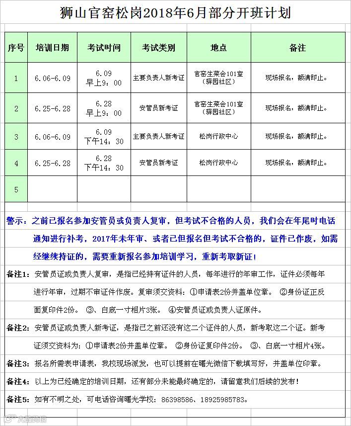 官窑松岗片区6月安管员/负责人份开班计划 佛山市曙安安全技术服务公司
