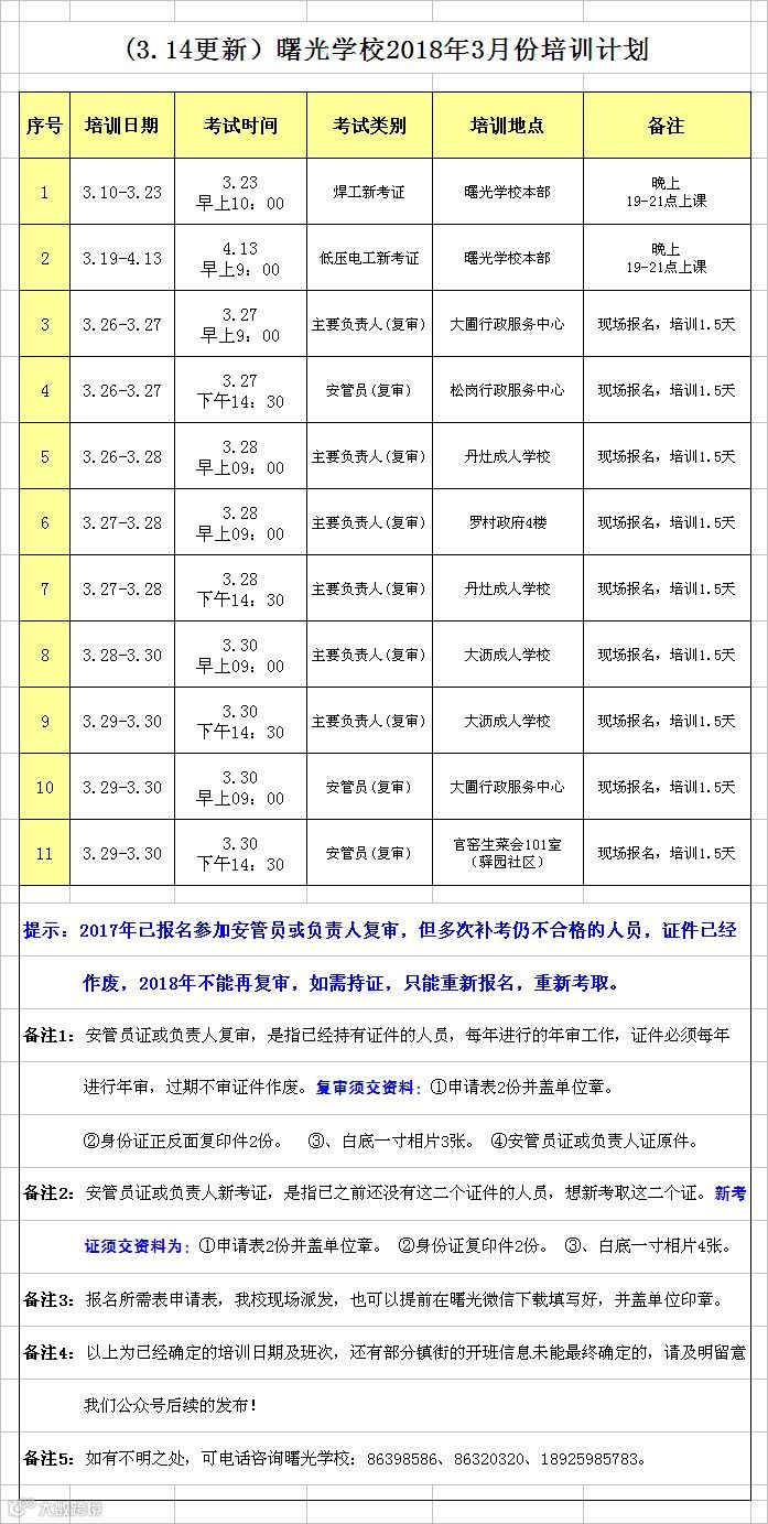 以下为已经确定的培训日期及班次,还有部分镇街的开班信息未能最终确定的,请及时留意我们公众号后续的发布!也可向单位所在村居或安监部门咨询、或致电我校进行咨询: