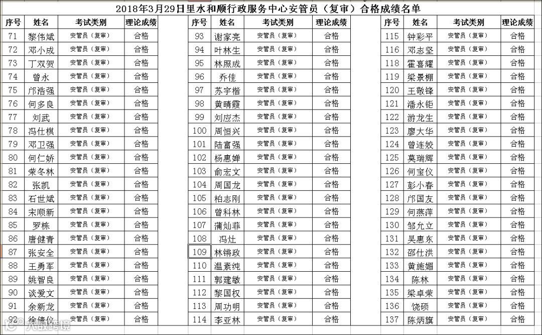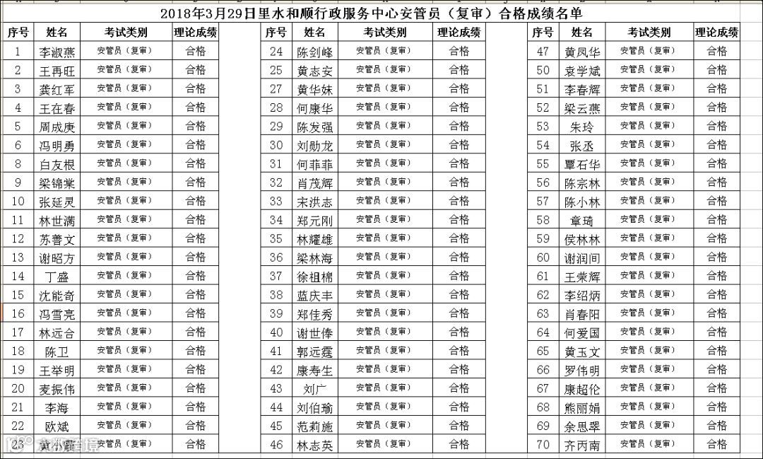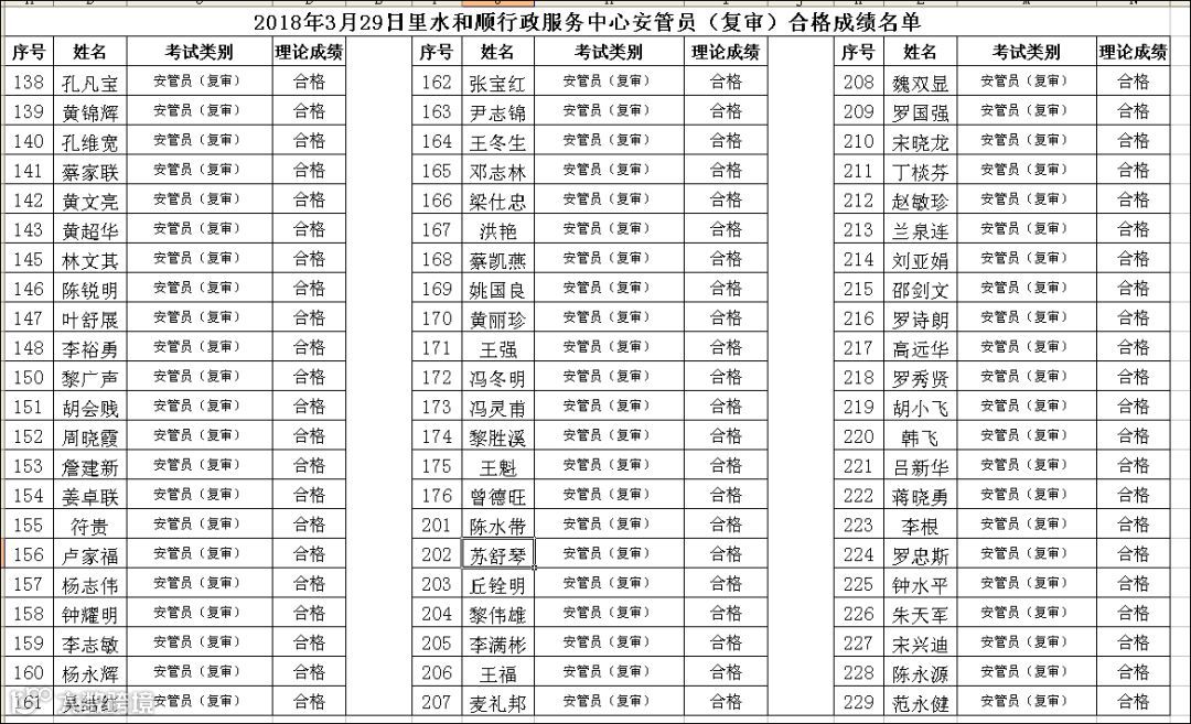2018.03.29里水和顺行政服务中心安管员(复审)考试合格名单