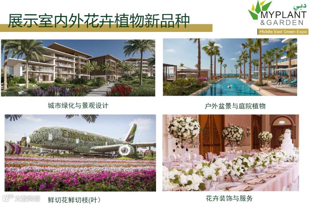 根据迪拜2040城市总体规划 (Dubai2040UrbanMasterPlan),为将迪拜打造成为“全球领先的沙漠绿化典范”,政府将在城市绿化方面采取多项措施,包括:公园和自然保护区总面积增加1倍,使居民在步行或短途驾驶范围内,即可享受城市绿色空间;酒店和旅游的公共海滩长度延长4倍,并建立滨海步道,使蓝色海洋空间与绿色景观完美结合;建立一条长约60公里,集生态、休闲、运动、社交于一体的巨型城市绿肺和公园式城市走廊;到2040年,实现迪拜城市绿化率提升至60%,为广大花卉植物育苗企业提供了新的出口机遇。