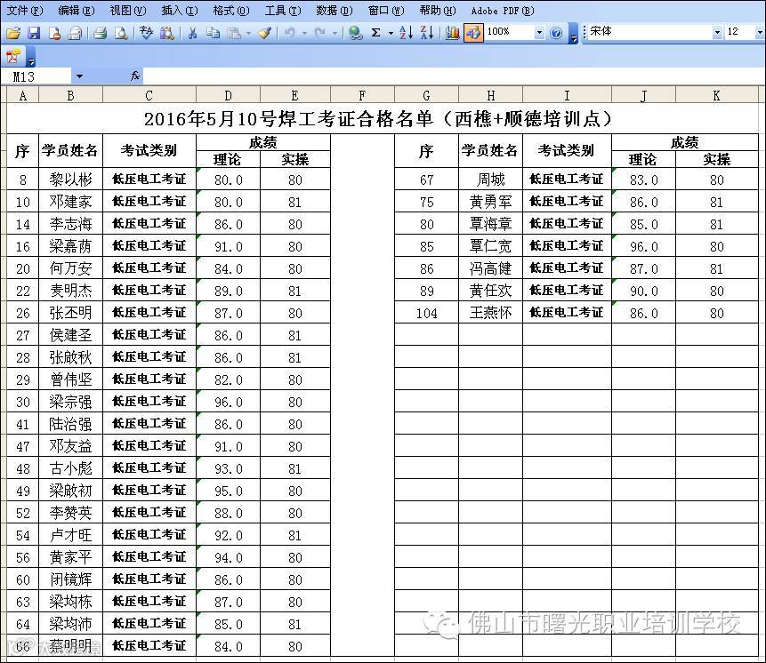 2016.5.10曙光学校焊工考证合格名单 佛山市曙安安全技术服务公司